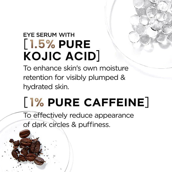 Aqua (Water), Caffeine, Kojic Acid, Maltodextrin, Glycerin, Propanediol, Epigallocatechin Gallatyl Glucoside, Gallyl Glucoside, Hyaluronic Acid, Oxidized Glutathione, Melanin, Glycine Soja (Soybean) Seed Extract, Pentylene Glycol, Hydroxyethylcellulose, Polyacrylate Crosspolymer-6, Xanthan gum, Lactic Acid, Dehydroacetic Acid, Trisodium Ethylenediamine Disuccinate, Propyl Gallate, Dimethyl Isosorbide, Benzyl Alcohol, 1,2-Hexanediol, Ethylhexylglycerin, Phenoxyethanol, Caprylyl Glycol.